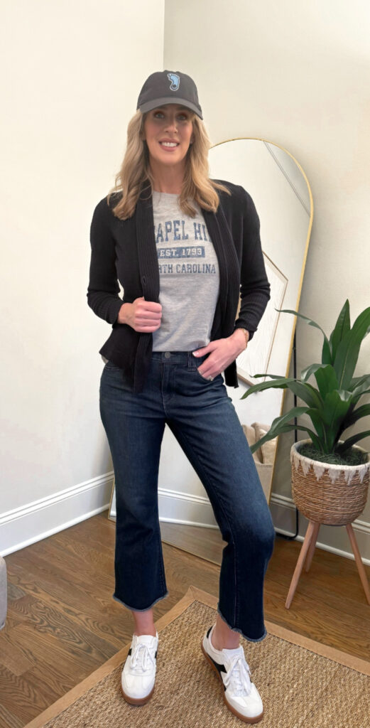 In your twenties and thirties, classic style might lean more playful, incorporating a graphic tee with tailored trousers, or experimenting with different things while building your foundational pieces. These are the years to establish your essential pieces and understand which silhouettes make you feel confident. Personally, I still wear a graphic tee with denim and a tailored blazer or a fitted cardigan. It feels effortlessly modern and equally classic. Plus, it is an excellent style for game day without making you feel like a cheerleader.